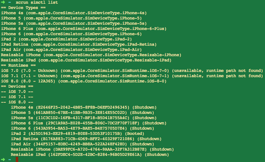 这里的Device_ID和Application_ID都是一串UUID,如果想查找不同的模拟器对应的Device_ID,可以通过在Terminal执行命令xcrun simctl list,如下图所示